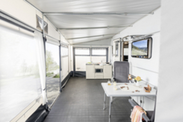 Auch das geräumige Vorzelt können Sie nutzen. Hier steht Ihnen eine luxuriöse Küche, stellenweise eine komfortable Dusche und natürlich eine gemütliche Sitzecke um dem Campingfeeling treu zu bleiben, zur Verfügung.